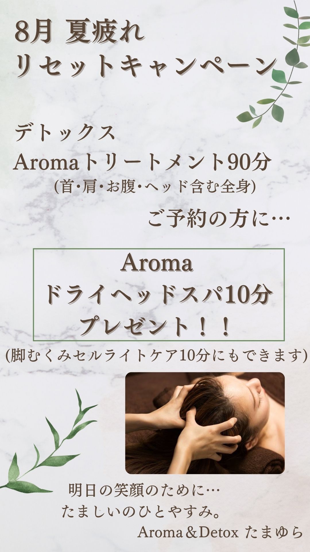 Aromaドライヘッドスパ10分(or脚むくみセルライトケア10分)をプレゼント